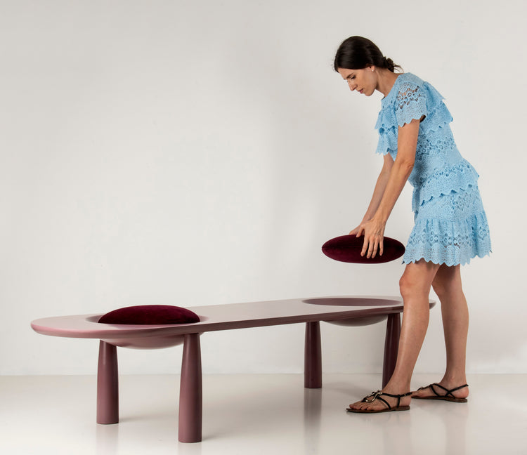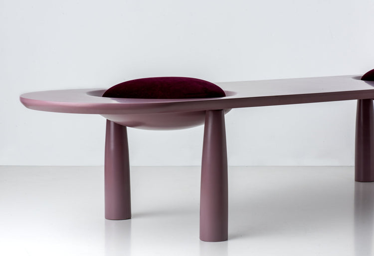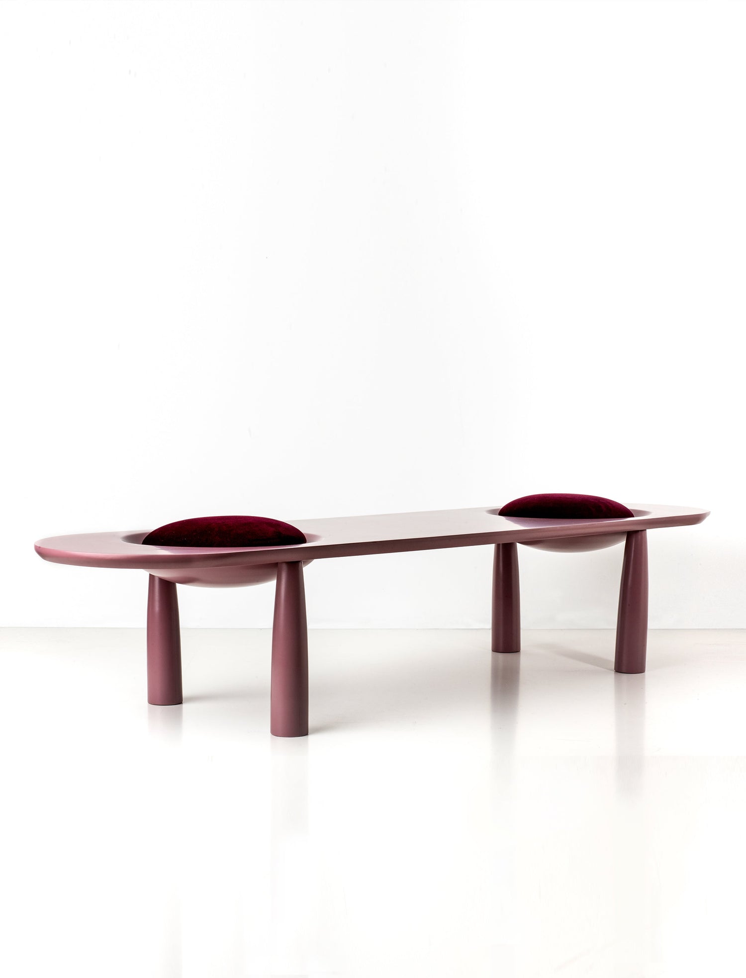 The famous Soft candy, popular in the 1980s, is the main inspiration for this bench. Its colors and rounded shapes were incorporated into the concept used in the choice of materials and treatments for this piece of furniture. The soft touch of the velvet cushions and the lacquered paintwork evoke the nostalgic sweetness of the artist's childhood.