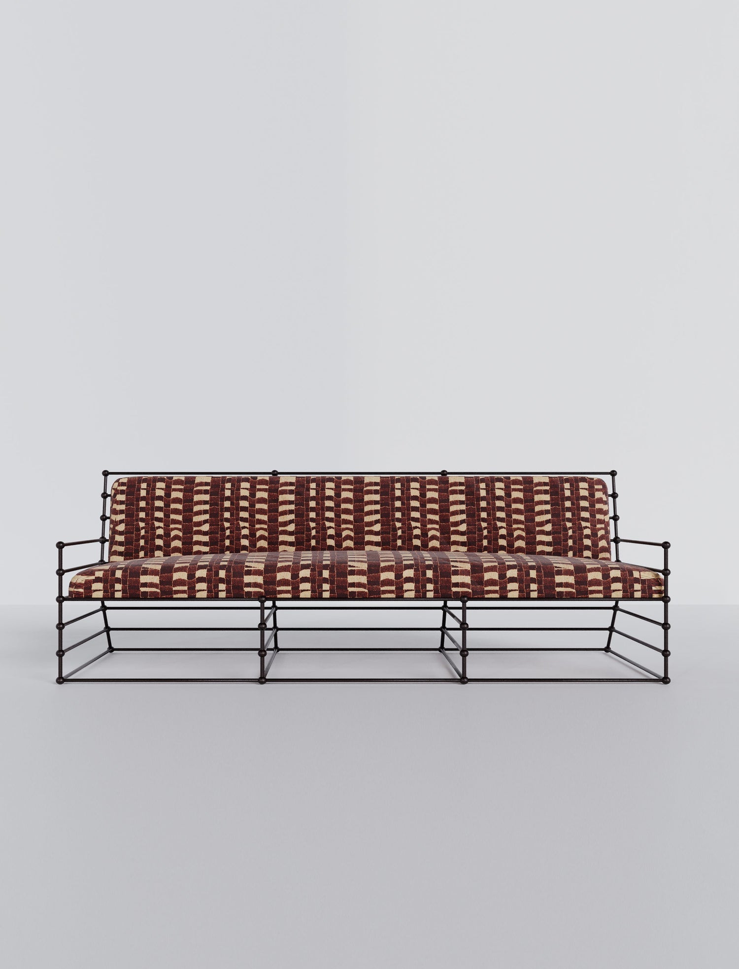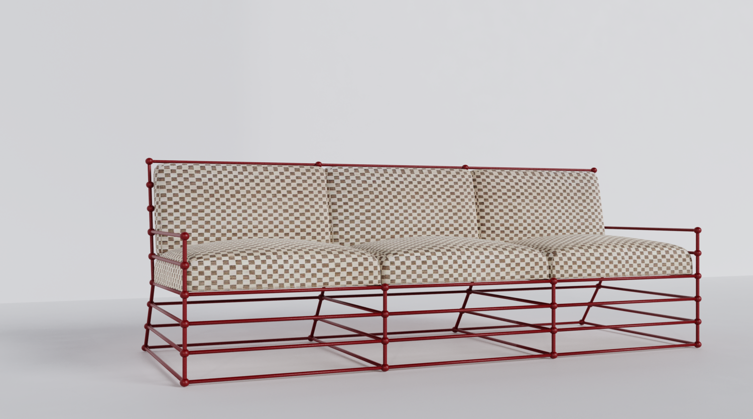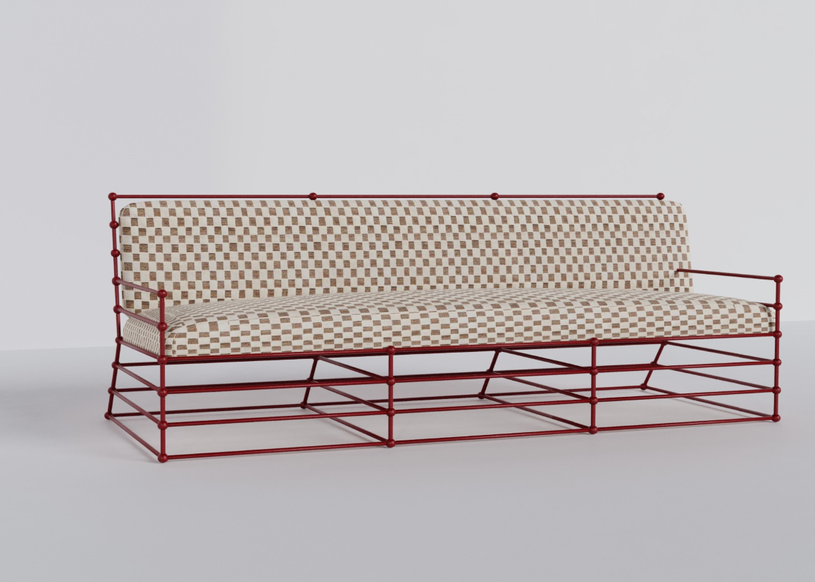 This outdoor furniture uses the geometry of the metal structure to create rhythm and balance, provoking a play of meaning. The grid emphasizes the idea of a cage. The horizontal lines create patterns punctuated by metal spheres that suggest musical notes and connect the metal segments of the furniture, paying homage to the revolutionary musician John Cage, through beats, passages, intervals, and coincidences.