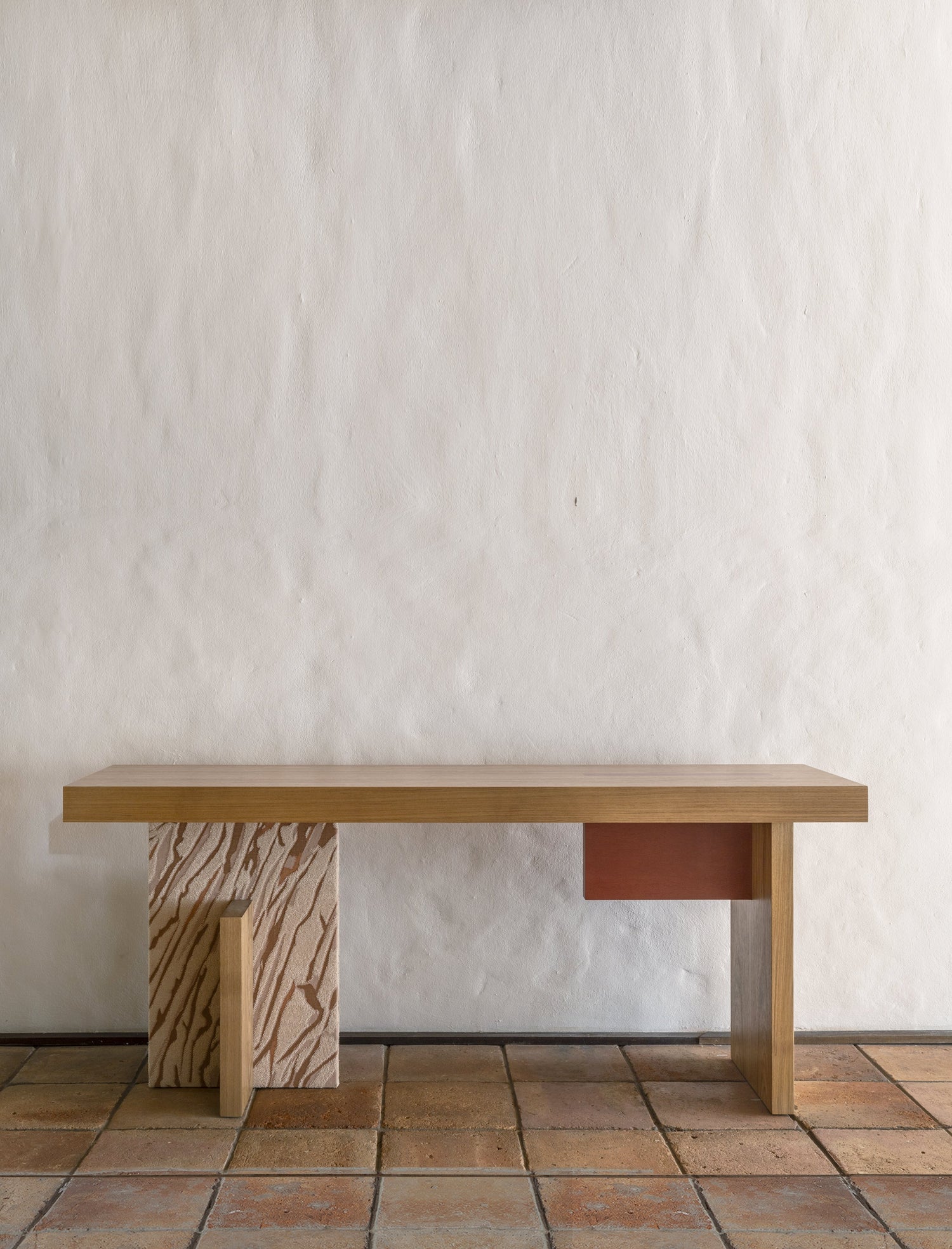 A work desk, sideboard, sofa, and bookcase are part of the NOMAD line, structured through the creation of wooden surfaces and the use of various upholstery materials. The modulation of straight lines unfolds into geometric and rhythmic interplays that guide these different pieces. The colors and textures evoke the landscape of Minas Gerais, as does the use of surfaces covered in jacquard knit fabric developed in partnership with Coven specifically for this furniture. Between the angles and voids, the topography appears as a source of inspiration in the sinuous and organic patterns of these pieces, which speak of belonging, identity, and practicality.