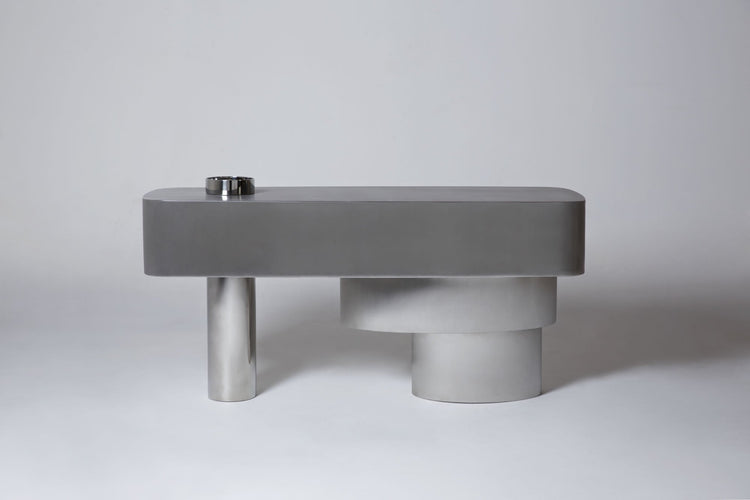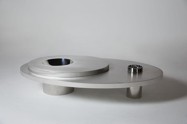The futurism and pop culture of the 60s and 70s guide the formal choices of the elements and materials that make up these pieces. The soft curves in brushed and polished stainless steel gently assimilate the colors around them, camouflaging themselves like chameleons. The differences in volume and texture transform these pieces into timeless design objects.