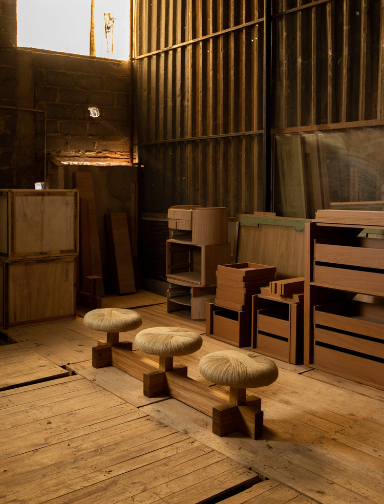 The benches in this series combine wood with natural fibers in complementary tones. Like the "Soft" and "Bilé" pieces, these pieces are organized around structural parts that incorporate the solidity of the wood with delicate and comfortable jute cushions and seats. Between the two composition options, the contrast between the negative and positive aspects of the spaces and connecting elements stands out. As furniture created for circulation and relaxation spaces, they combine sobriety, elegance, and beauty.
