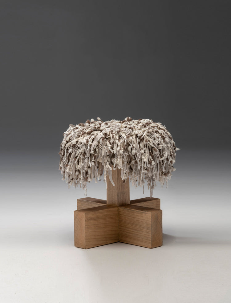 Intriguing, sensorial, and playful, Bilé provokes us with its textures and materials, woven by the hands of textile artist Bilé, who gives the piece its name. As a creation, this piece synthesizes the contemporary values of dialogues between cultural matrices, knowledge, and traditions, without hierarchizing these references. As a provocation, it leads us to reflect on the divisions between art, design, craftsmanship, and industry.