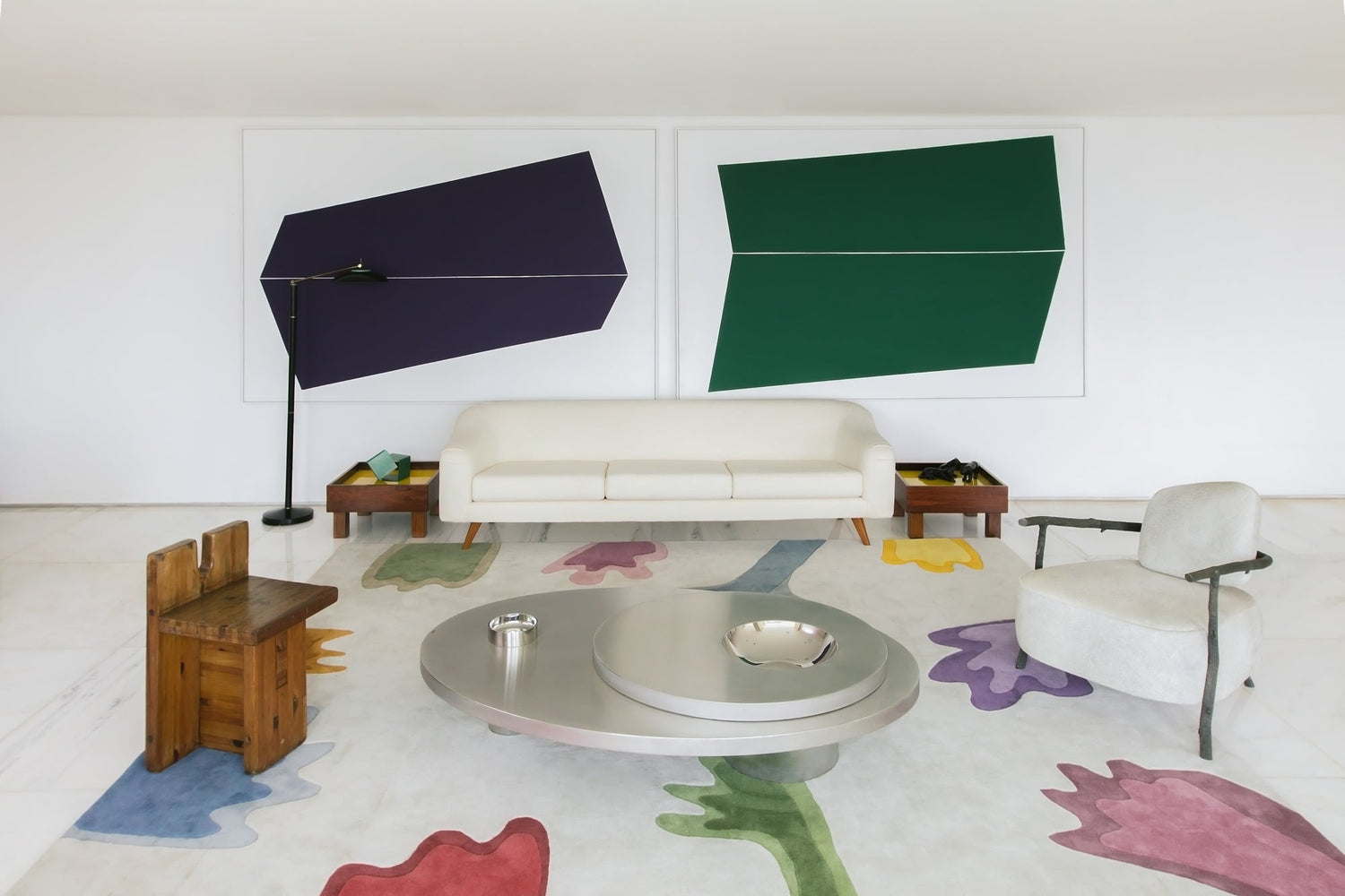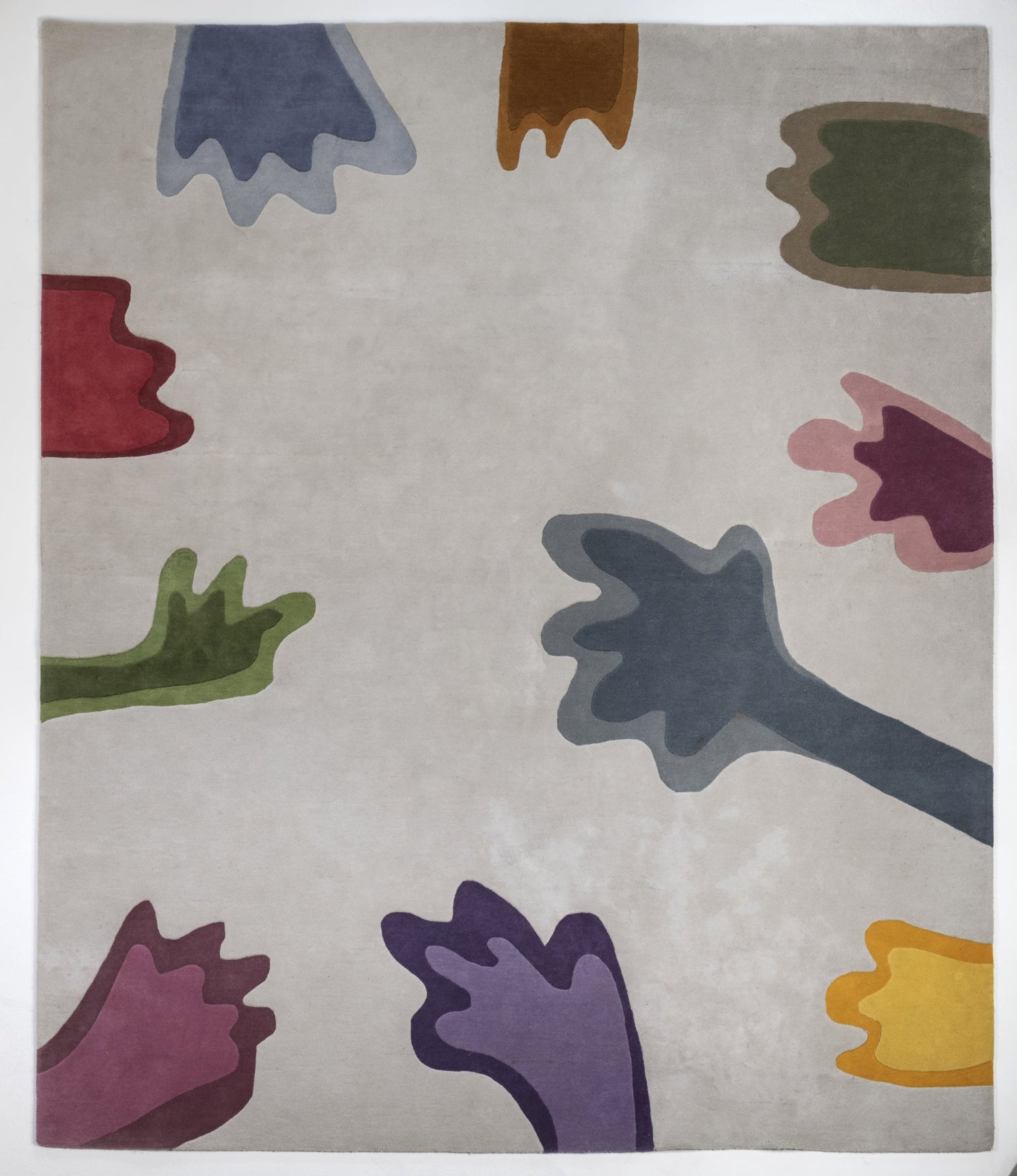 The "Hands" rug is hand-woven in India from dyed wool, with a design reminiscent of a wheel formed by hands. Made in three different heights, it creates texture and depth. The hands, in various vibrant colors, are arranged around the perimeter of the rug and point toward the center, standing out against the neutral background. Available in hand-tufted or hand-knotted techniques.