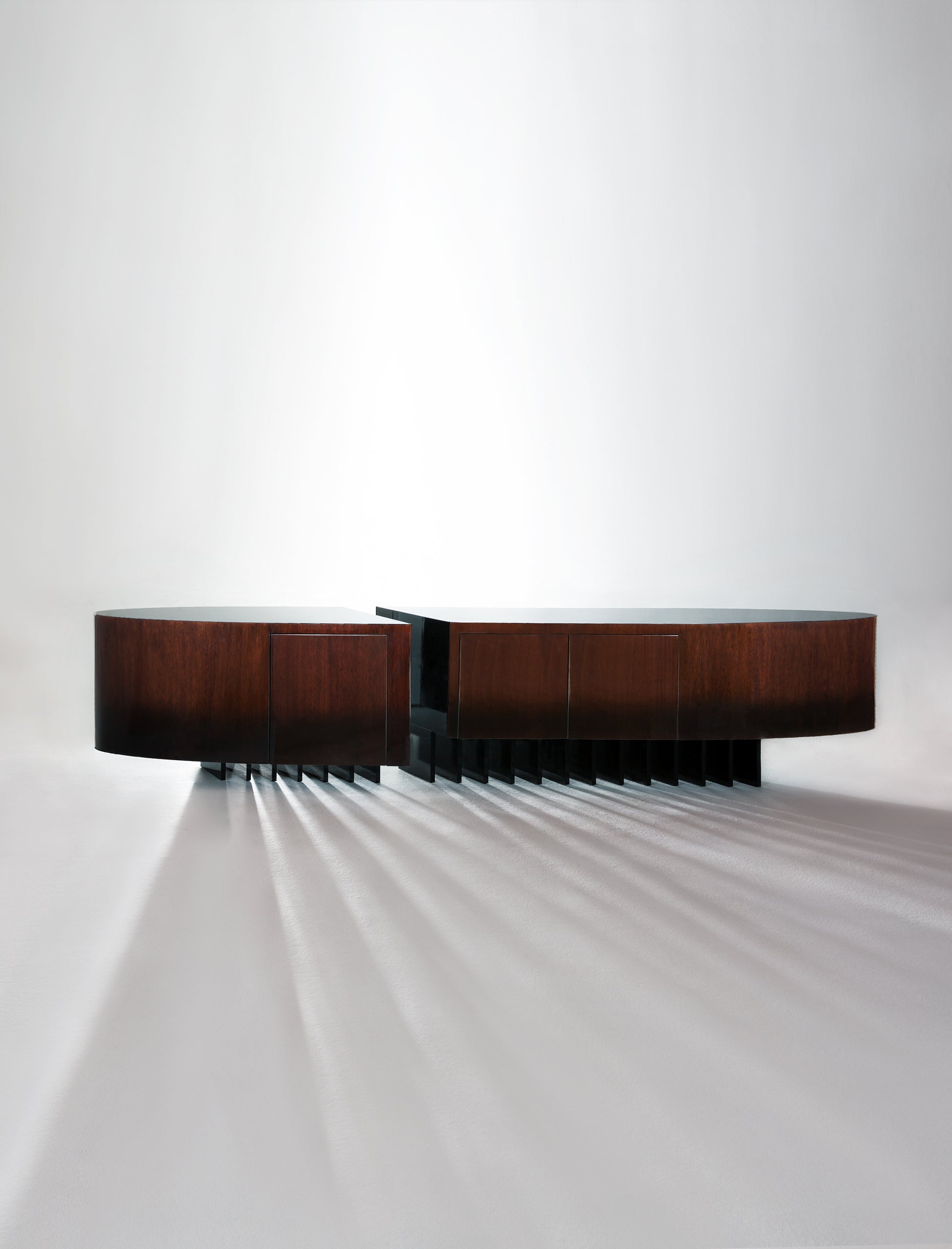 The sobriety of this piece's main element, compact yet segmented, distracts the eye from the rhythmic provocation created by the feet and the gap between the volumes. Like a sculptural object, it projects itself into space as a rupture and a break in rhythm through connections made through this void. The gradient paint on the wood, which darkens as it approaches the ground, reinforces the visual play provoked by this piece, which speaks of gaps, hiatuses, and invisible connections.