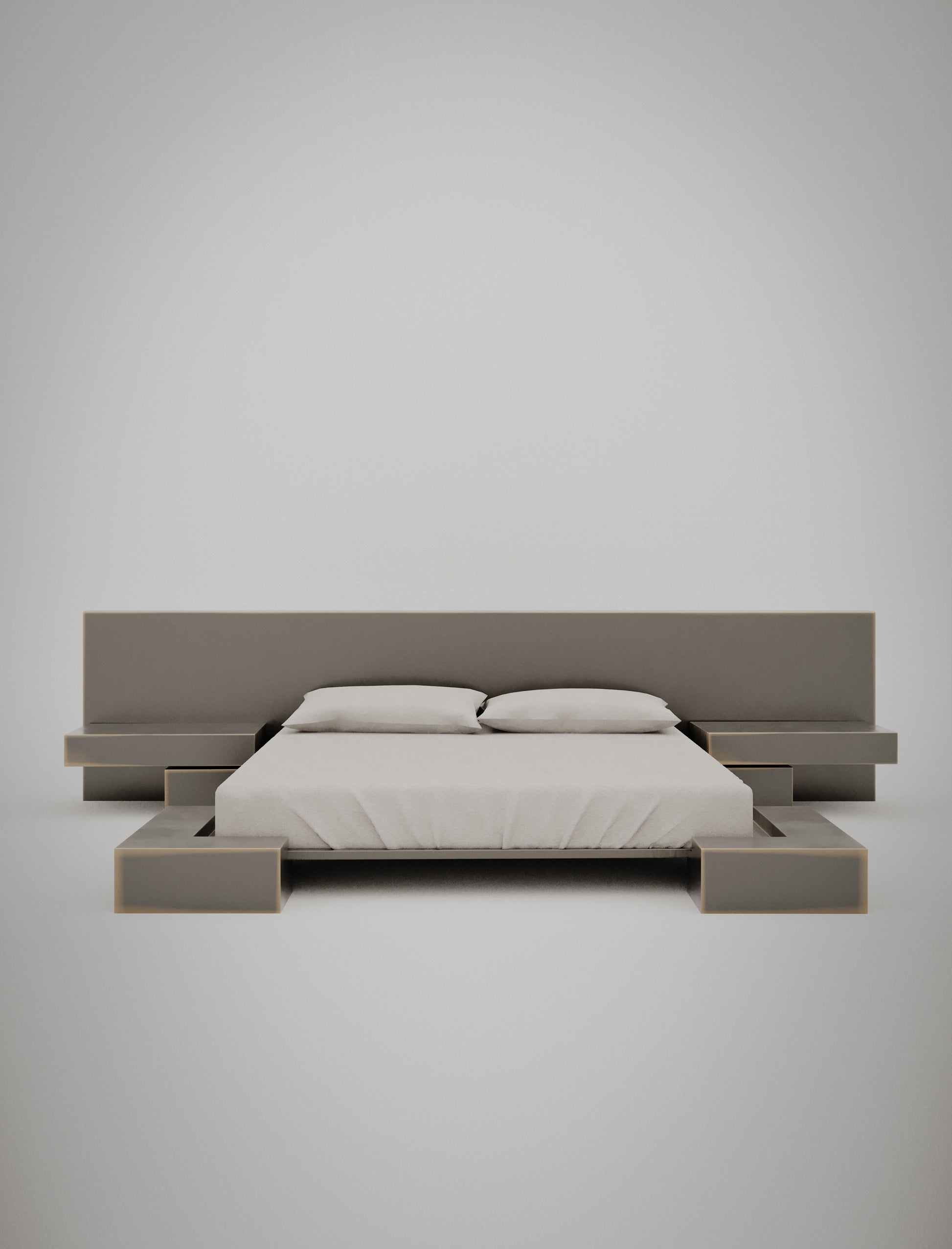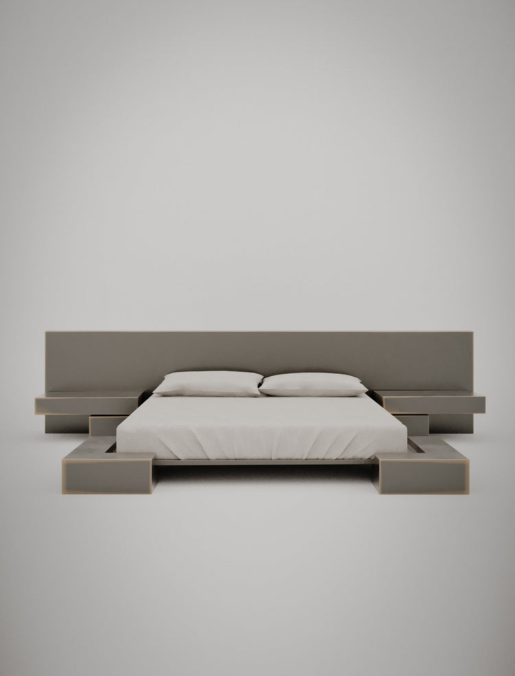 The platform bed concept revives a functional intention that characterized modern Brazilian furniture, incorporating a contemporary approach to the volumes and choice of materials. Constructed of metal—stainless steel or carbon steel—the piece's horizontal lines utilize the shape of the mattress as an element within this composition created in space with planes, rectangles, and voids. Like a tatami mat floating in midair, the bed extends into bedside tables and platforms in sophisticated interplays of balance and stability.