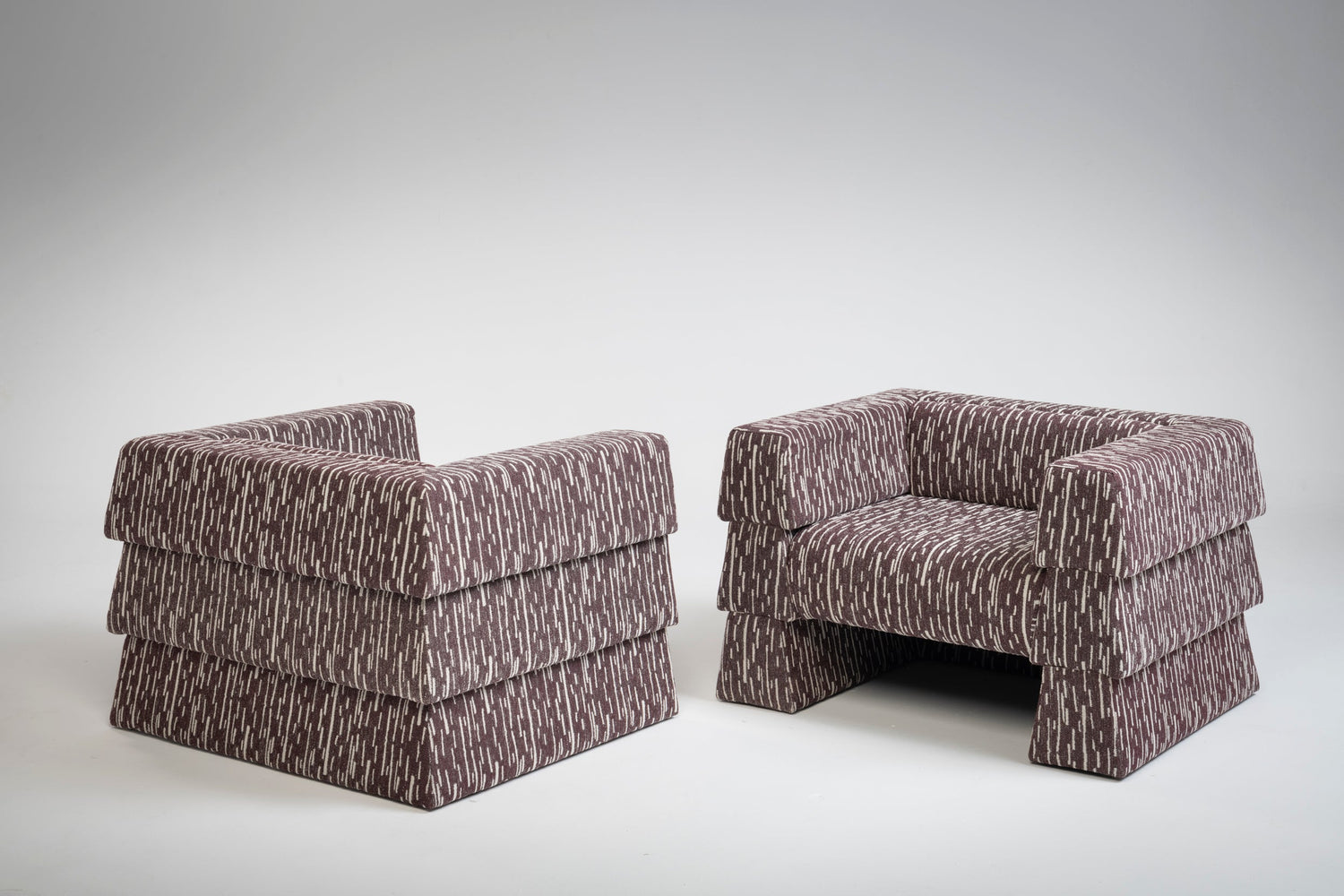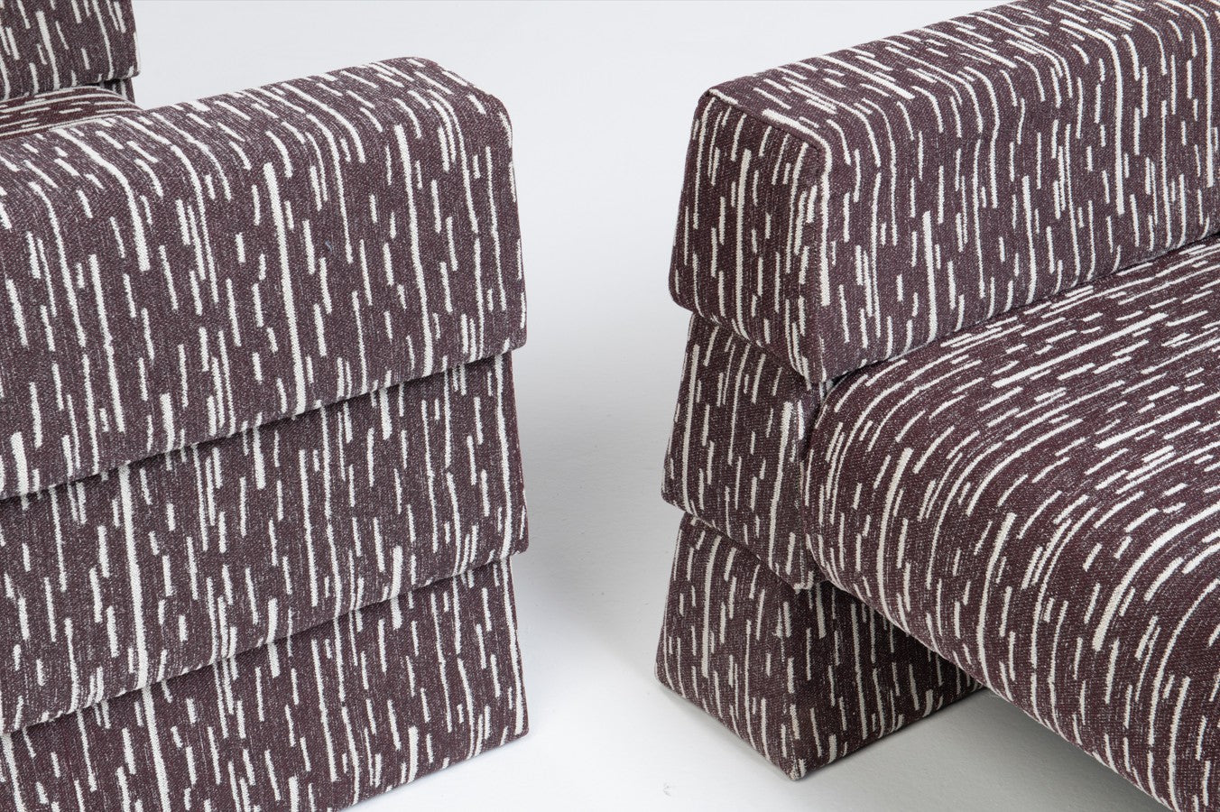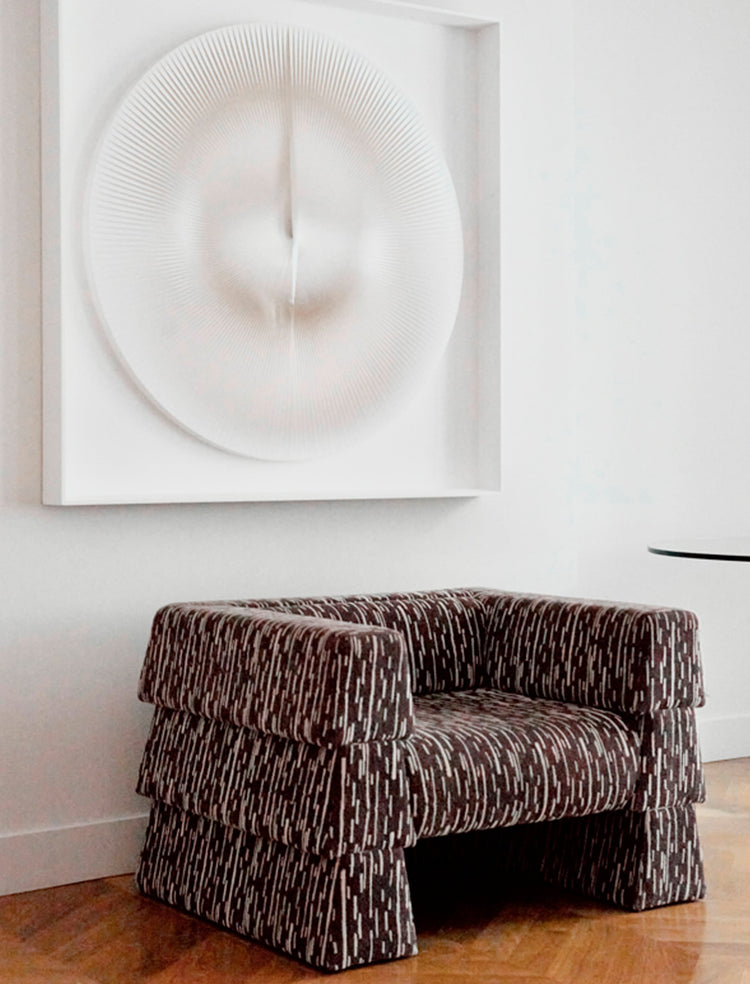 The overlapping and repetition of upholstered geometric blocks define the essence of this design: rhythm. While the right angles and stacking evoke minimalist actions, the brutalism of the absolute forms and their sharp angles lead to an industrial aesthetic. A contemporary look at modern paradigms.
