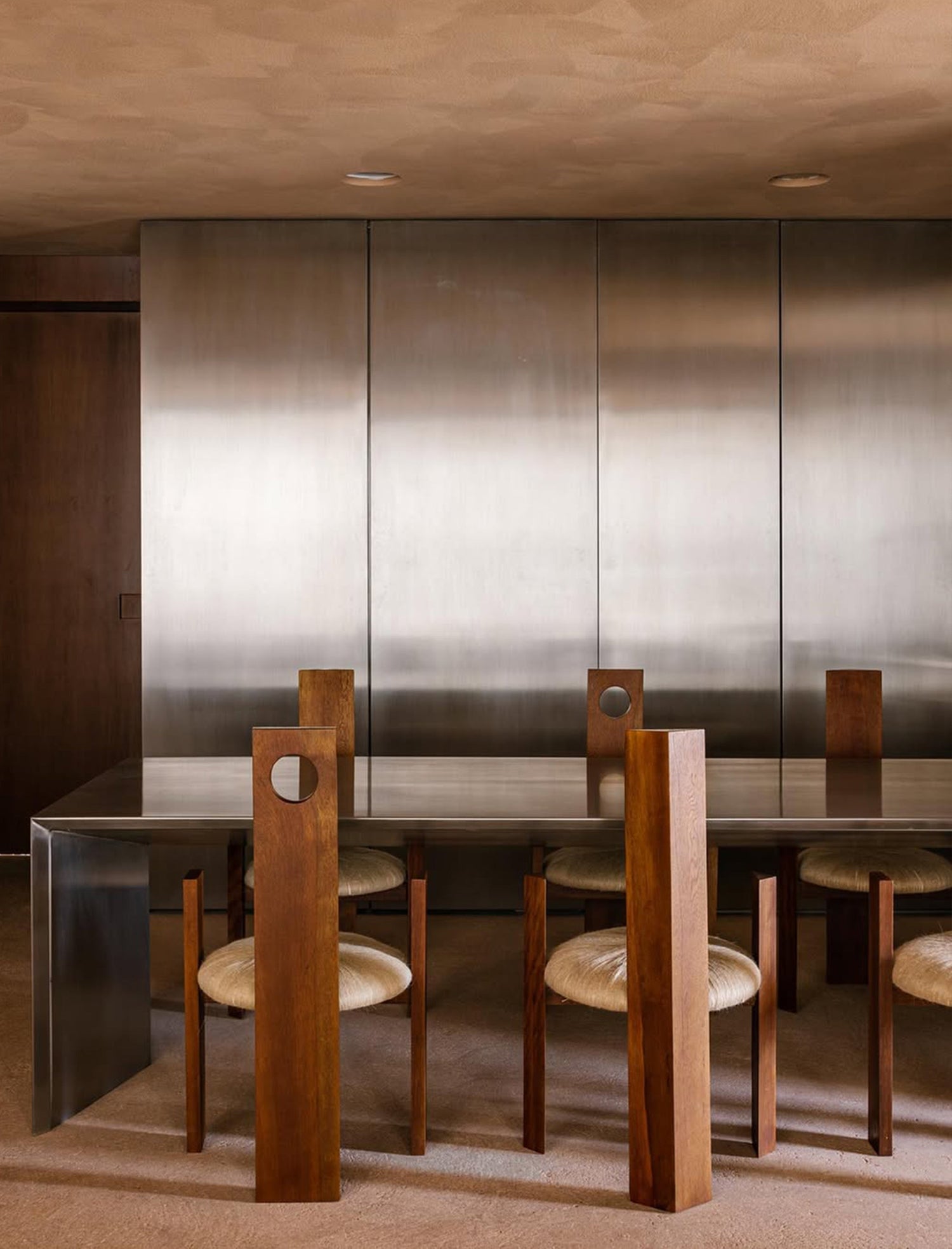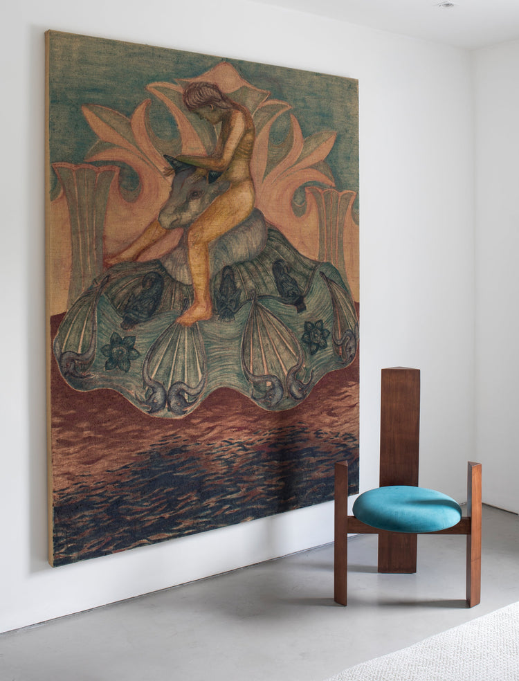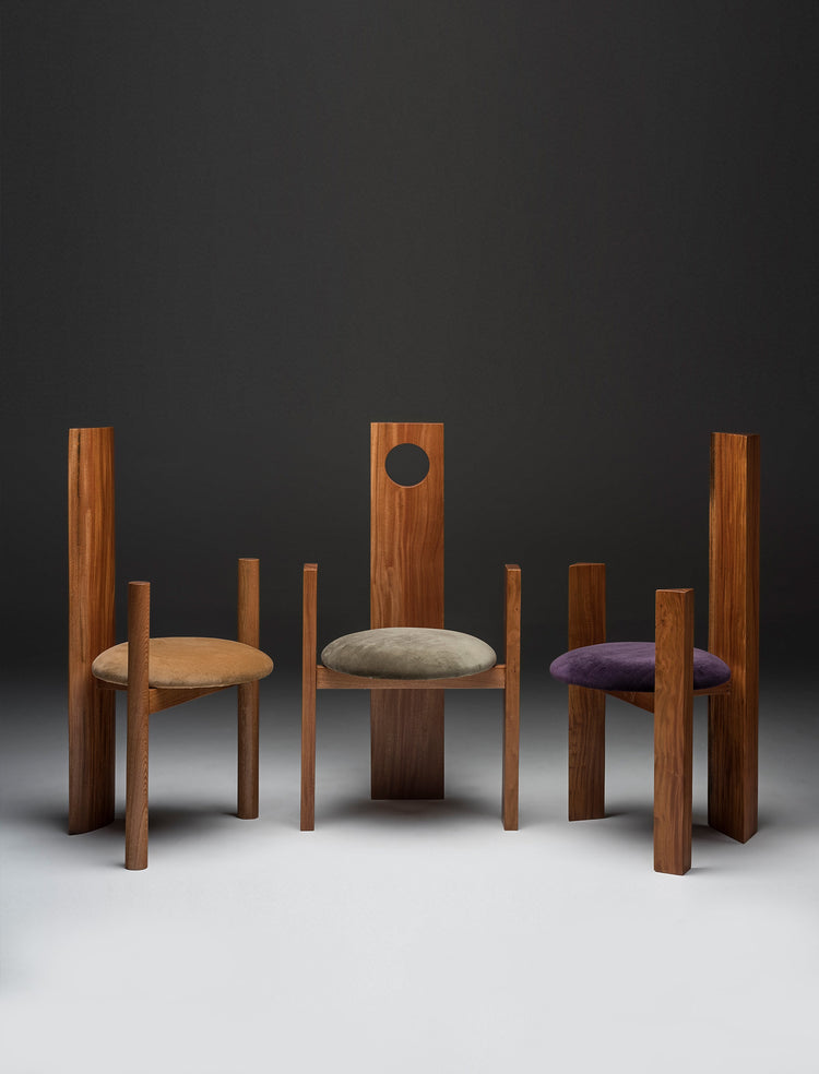 In dialogue with the tradition of Brazilian modernist furniture, the Tri chairs incorporate pure geometric forms—the circle, triangle, and rectangle—to create a structure that embodies the synthesis and rhythm of minimalism. The contrast between natural solid wood and velvet upholstery makes these pieces stand out for their verticality, reminiscent of both trees and thrones found in various cultures and civilizations, in a blend of tradition and contemporary.